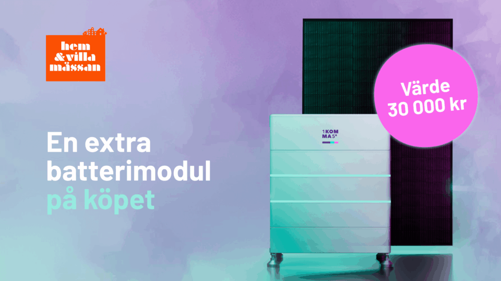 I samband med Hem&Villamässan i Malmö erbjuder vi en extra batterimodul till alla som köper solceller+batteri eller endast komplett batteri från oss på 1KOMMA5° – Värde hela 30 000 kr.