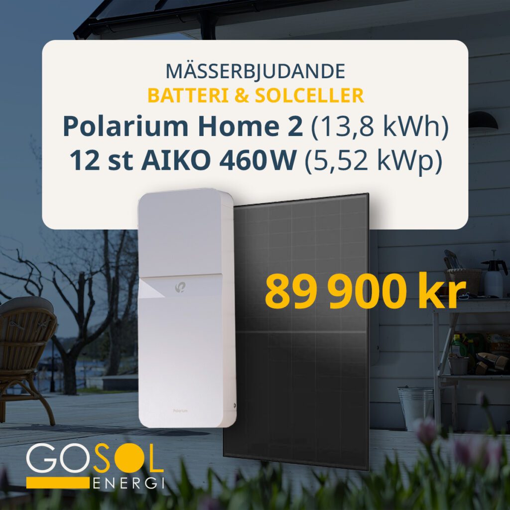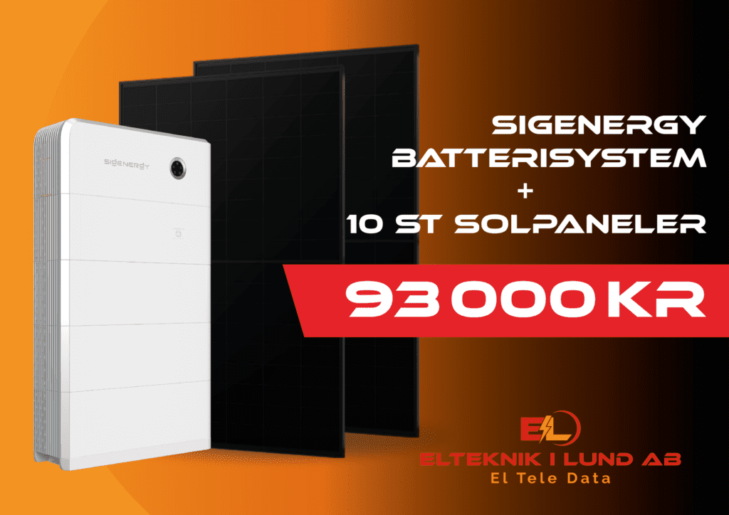 Exklusivt för Hem & Villamässan erbjuder vi just nu ett komplett solcellspaket med Sigenergy batterisystem för endast 93 000 kr – installerat och klart. I paketet ingår 10 högpresterande solpaneler från Aiko, ett kraftfullt 18 kWh batteri från Sigenergy samt en 12 kW växelriktare från Sigenergy (TP2). Det här är en smart och framtidssäker energilösning till ett riktigt förmånligt mässpris. Kom förbi vår monter B:50 och kika på systemet!