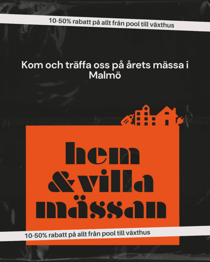 I samband med Hem & Villamässan i Malmö har vi massor med nedsatta produkter på tvärs av hela vårt breda sortiment. Allt för dig som är ute efter en ny pool eller renovera en gammal till dig som vill förgylla din utemiljö med växthus, bastu och nya utemöbler. Kom och besök oss i monter E:29 (utemöbler, växthus och grillar) och E:43 (pool, spa och bastu).
