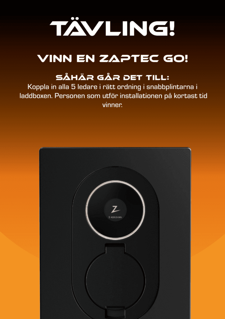 Under mässdagarna har du möjlighet att vinna en Zaptec Go laddbox inkl. installation! Du deltar i tävlingen genom att prova på att installera en laddbox. Koppla in alla 5 ledare i rätt ordning i snabbplintarna i laddboxen. Deltagaren som utför installationen på kortast tid vinner.